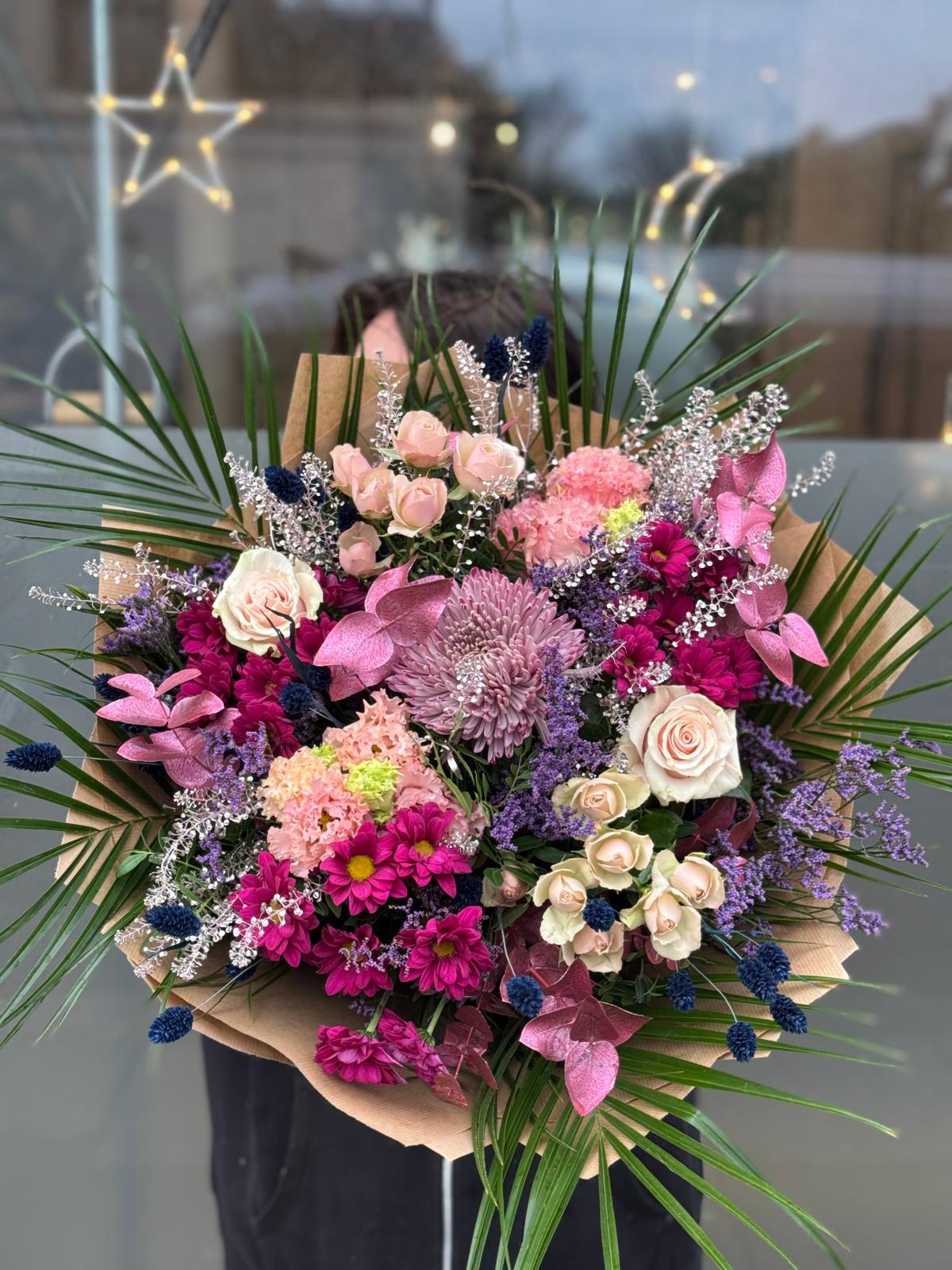 This bouquet is a captivating blend of soft pinks, deep purples, and rich navy blues, evoking the enchantment of frosty evenings. Featuring blush pink roses, plush purple chrysanthemums, and delicate lisianthus, it’s accented with airy limonium and shimmering lepidium. Sprigs of metallic eucalyptus add a touch of winter magic, creating a chic and sophisticated arrangement perfect for the season.